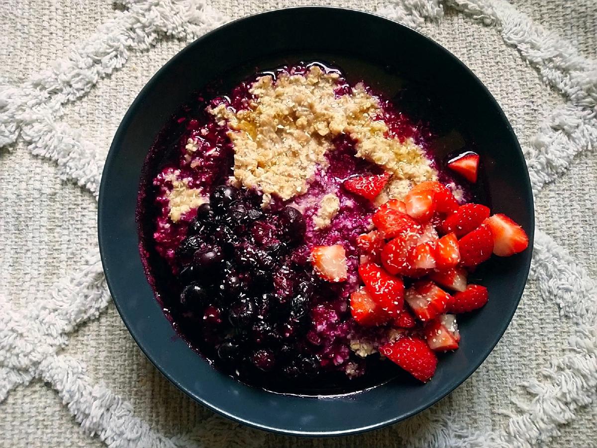 In this oatmeal the blueberries are cooked for a bit, and then they are added at the end. This helps out a lot with the goopy texture of the oatmeal. Good balance, also the strawberries lift it up a bit. Topped with some shredded coconut and maple syrup.