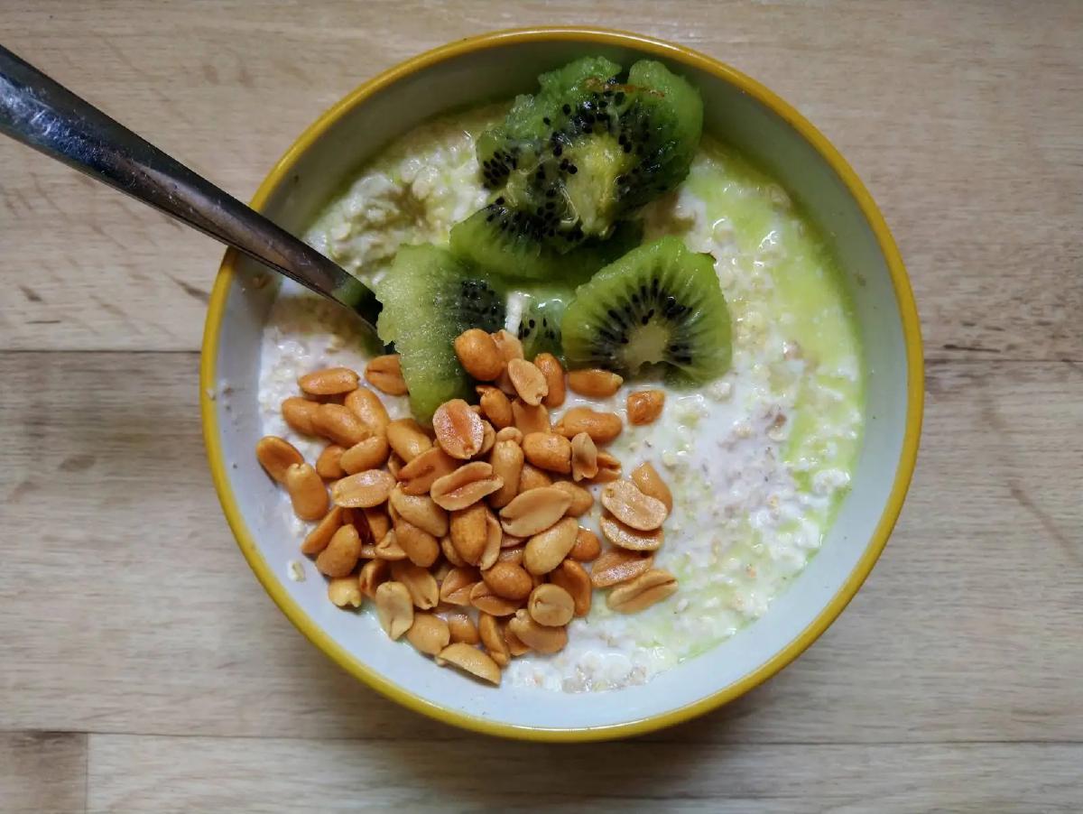 This is an unusual flavor combination. Kiwi is actually a very decent oatmeal topping, as any fruit. I think the sourness is quite important to balance out the texture of the oatmeal. Almond milk is one of the better ones for oatmeal.