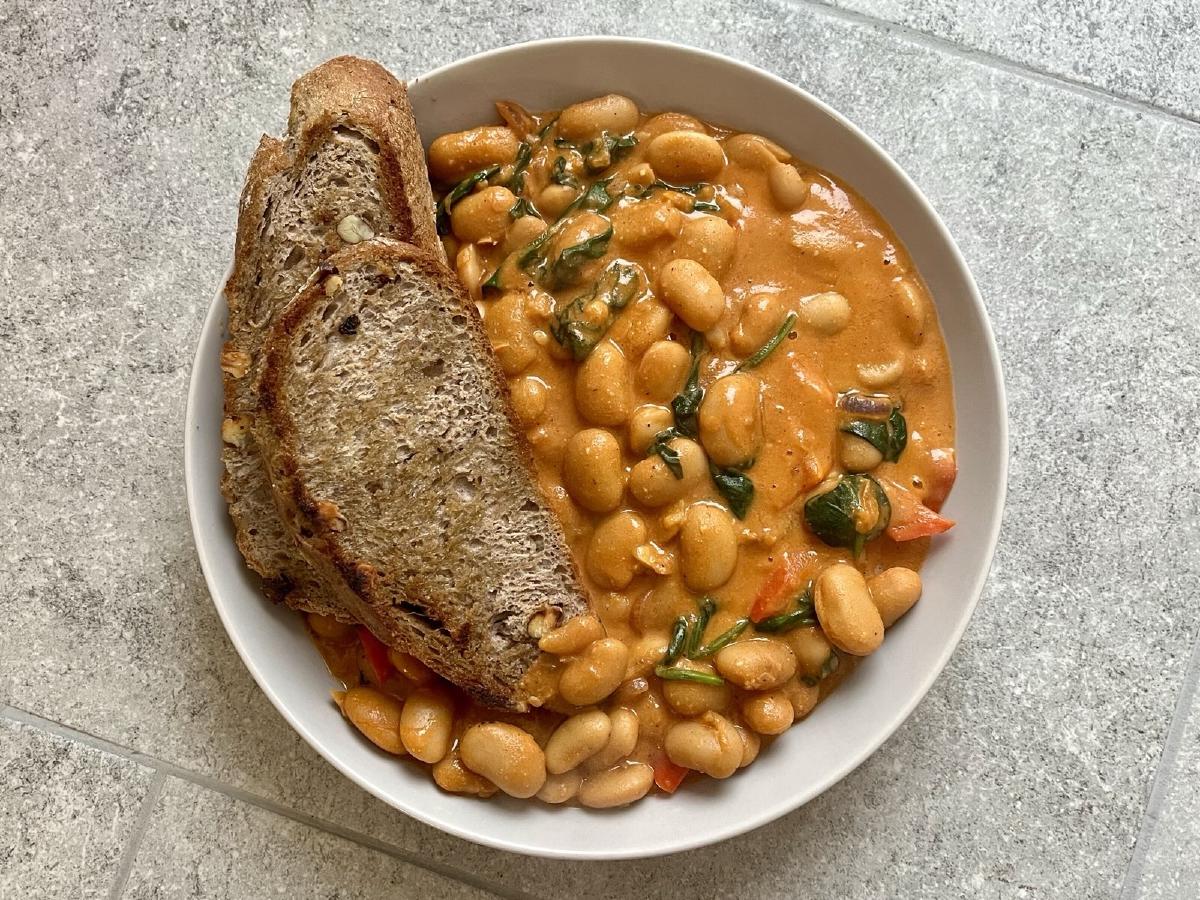 - Stir the cashew cream into the tomato and butter bean mixture, cooking for another 2-3 minutes until heated through. If using, add fresh spinach and cook until wilted.