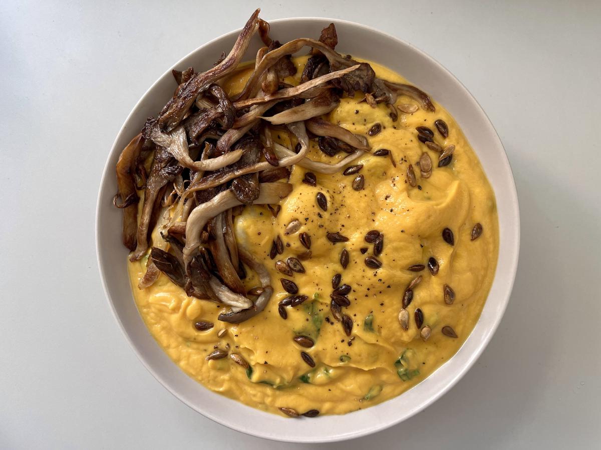 - Blend roasted squash (flesh only), garlic, cashew cream and stock/water until silky. Adjust thickness and seasoning.