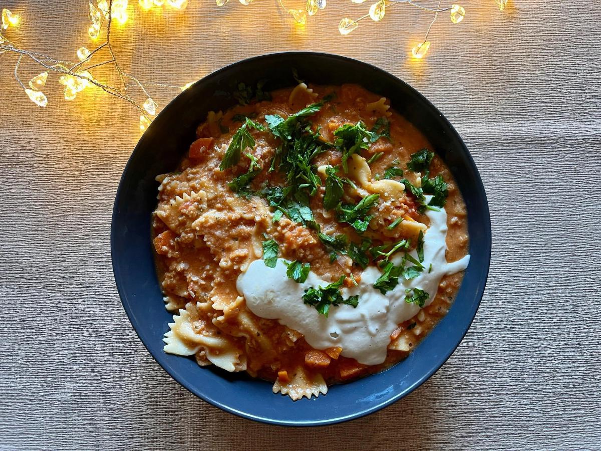 Pasta in soup will always be a favorite of mine. Especially if I have any leftovers. This recipe is for a kind of lasagna-like soup using a lot of tomatoes, cashew ricotta and farfalle pasta.