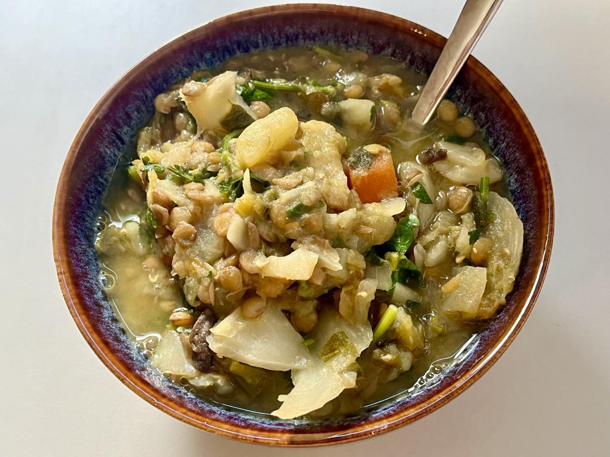 - Mash a small portion of the potatoes and lentils against the side of the pot to thicken slightly (do not overdo).