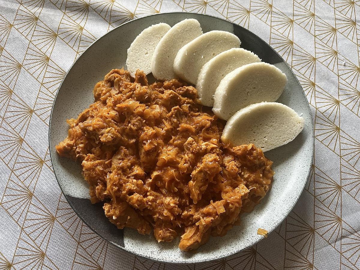 I will gladly be the first to admit that a lot of my recipes lately have been looking a little beige. But no matter! This is a classic Hungarian comfort food. I bought the dumplings pre-made, but you can make them yourself. They’re quite simple. I might have a recipe for them soon.